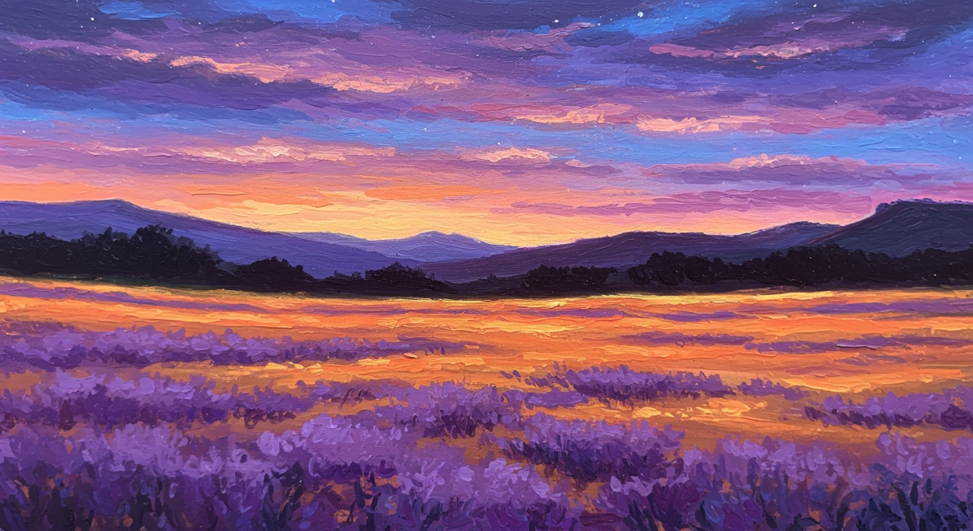 노란색, 주황색, 빨강, 보라 등의 색을 부드럽게 블렌딩하여 자연스러운 그라데이션을 만들고, 어두운 실루엣은 마지막에 그려 넣습니다.